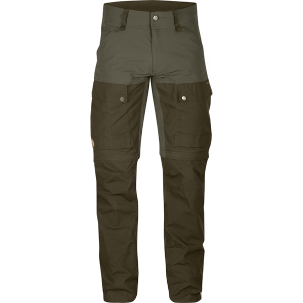 Prisvinnende Keb-bukse, nå med avtakbare gamasjer. Teknisk avansert turbukse med optimalisert passform og omhyggelig gjennomtenkte detaljer. I varmt vær kan den nederste delen av bena tas av for å gjøre om buksen til en shorts, akkurat som på vanlige bukser med avtakbare ben. Delen som tas av, har snorjustering ved leggen, som sammen med støvelkroken på benavslutningen beskytter leggene i terreng med mye busk og kratt. Stoffet er elastisk med G-1000 Eco over setet, foran på bena og over knærne for ekstra slitestyrke. Benavslutningen er også forsterket med ekstra slitesterkt G-1000 HeavyDuty for å stå imot slitasjen fra turstøvlene. Setet og knærne er forhåndsformet og har ekstra sterke sømmer. Sømmene på innsiden av bena er flyttet fremover for å redusere risikoen for at de skal gnage. En ventilasjonsåpning med glidelås fra kne til hofte slipper ut overflødig varme, og selv gylfen er forlenget for å gi ekstra ventilasjon om nødvendig. To benlommer med klaffer, der den ene har en innvendig nettinglomme til mindre gjenstander, for eksempel telefonen. Håndlommene er plassert så høyt at innholdet ikke faller ut når du setter deg ned. Snorjustering ved benavslutningen og, i tillegg til den skjulte støvelkroken, er benavslutningene utstyrt med maljer som du kan feste snorer eller metallkroker i – enda en måte å feste buksebenet på for å hindre rusk og rask eller snø i å finne veien ned i støvlene.