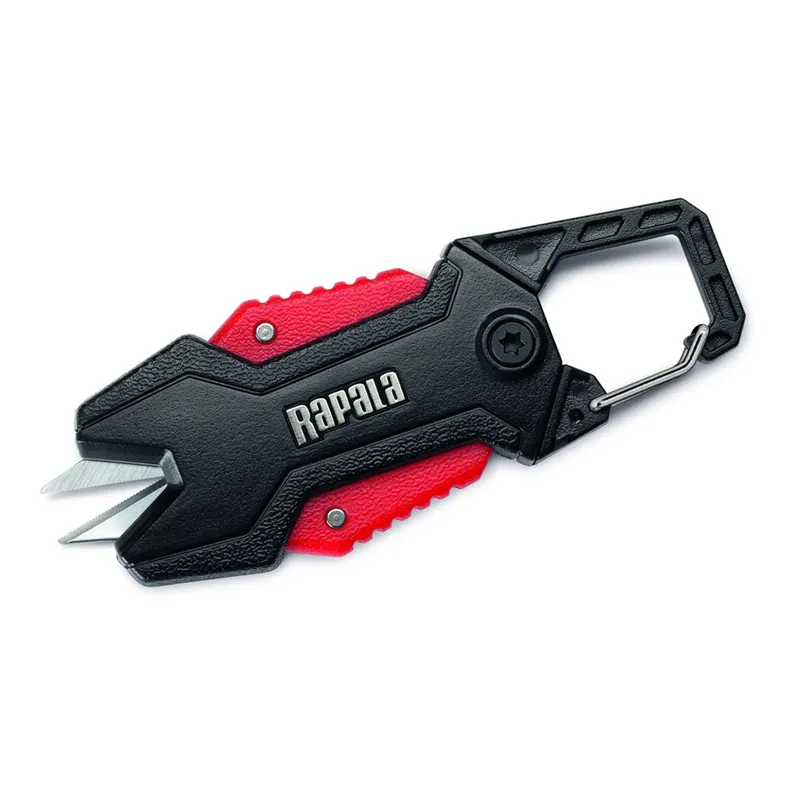 Rapala RCD Lineklipper. Saks med skarpt rustfritt blad til sene og line. Sikkerhetsfunksjon som gjør at knivbladene trekker seg inn i saksen etter bruk. Karabinkrok for å hekte på jakke, sekk eller vest. Lengde: 9 cm