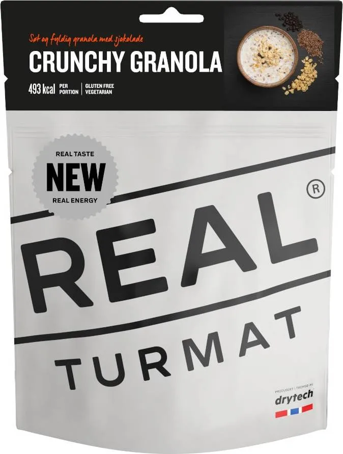 Søt og fyldig Crunchy Granola med sjokolade. Real Turmat Granola Med Sjokolade er en glutenfri frokost som gir deg en pangstart på morgenen og god metthetsfølelse. Kan tilberedes med kaldt eller varmt vann.