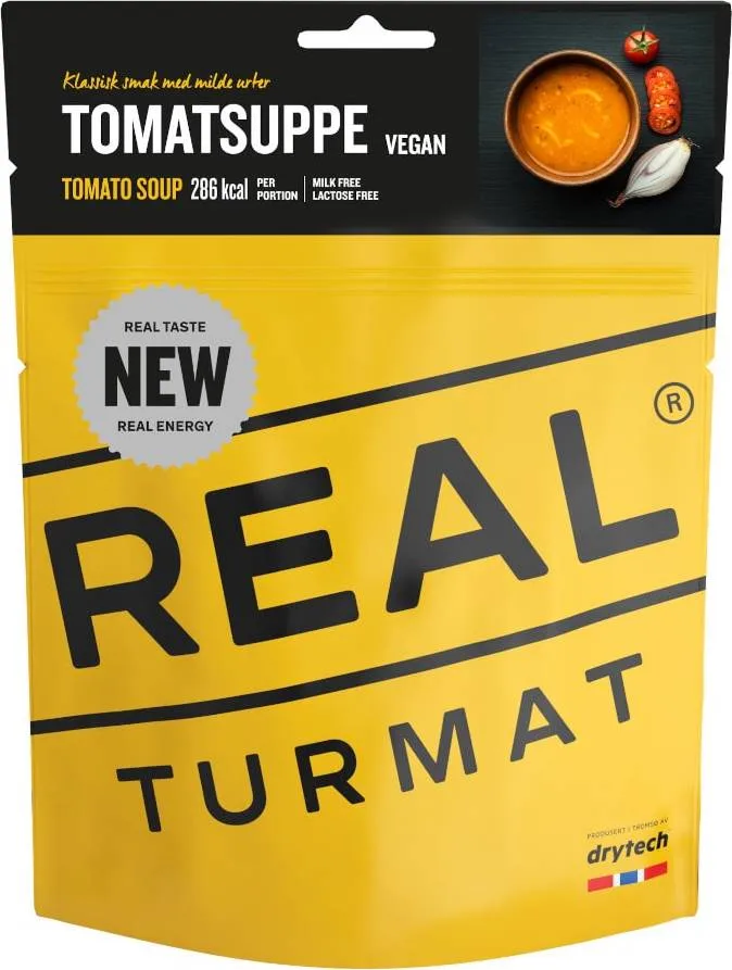 Real Turmat Tomatsuppe har en klassisk smak med milde urter og er en tidløs favoritt som passer perfekt å ta med seg ut på tur. Denne retten er laktosefri, melkefri, vegetar og vegansk.