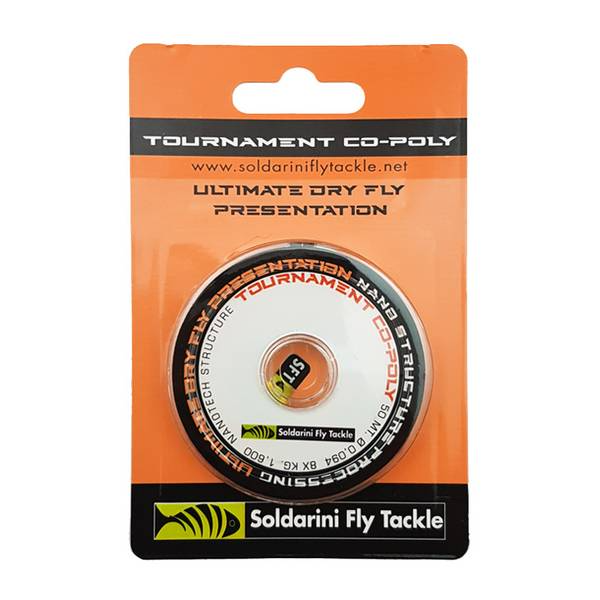Soldarini Tournament Co-Poly er siste generasjon monofilament til fluefiske. Tournament Co-Poly er produsert i Japan og ved bruk av nanoteknologi. Det har resultert i et fantastisk sterkt spissmateriale som passer perfekt til tørrfluefiske. Etter å ha testet Tournament Co-Poly under praktisk fiske tør vi påstå at det er det beste vi har testet i denne kategorien. I særdeleshet med tanke på knutestyrke og lite minne! Det siste er svært viktig ved fiske i stillestående vann, som for eksempel under myggfiske. Perfekt stivhet i forhold til flyt i elv har det også. Så Tournament Co-Poly ble umiddelbart en ny favoritt.